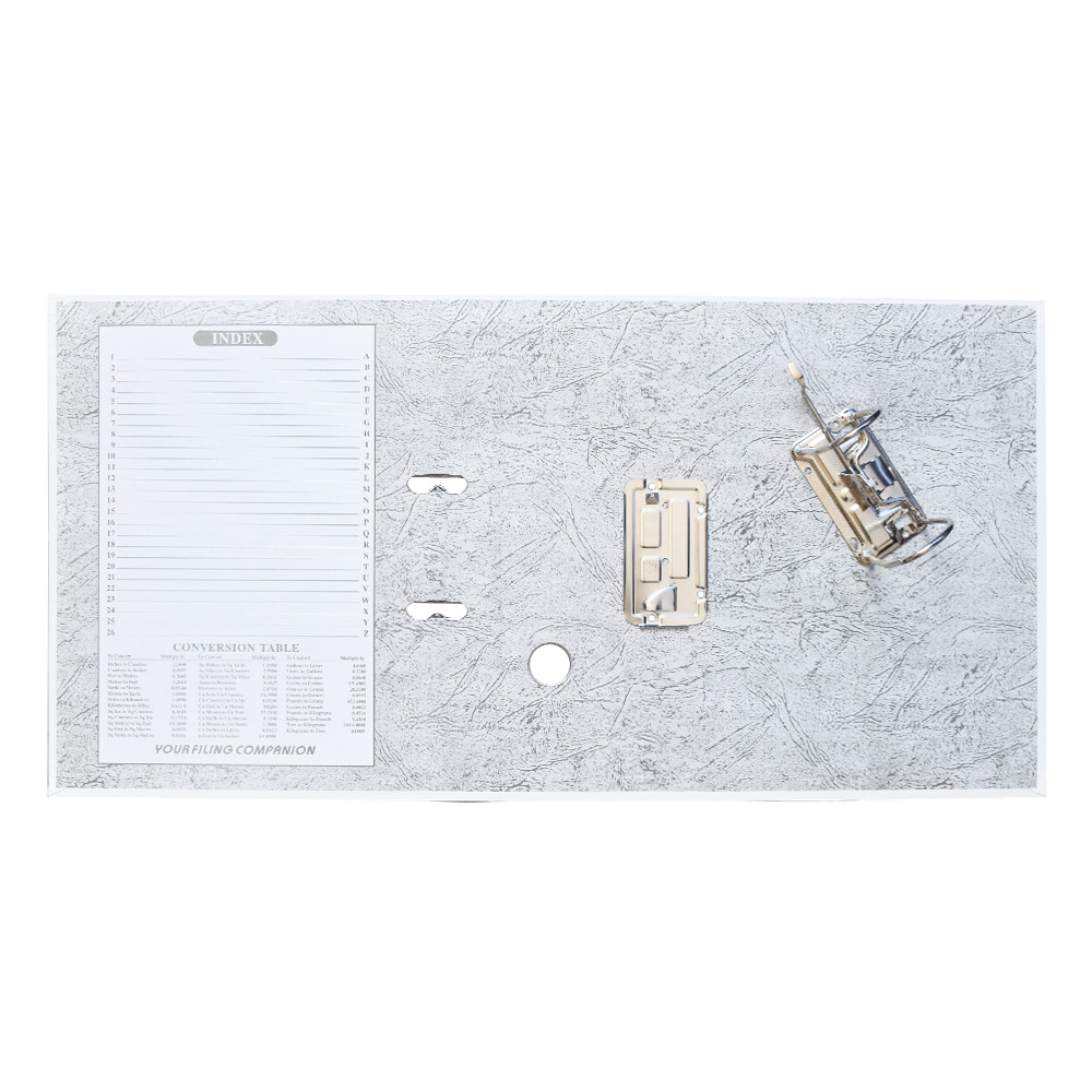 Emelőkaros iratrendező általános használatra. Kívül PP, belül fehér karton borítással, kihúzólyukkal. Cserélhető gerinccímke a feliratozáshoz. Tárolókapacitás 500 lap (A4 80gr.). A terméket lapra szerelve szállítjuk, a mellékelt emelőkaros szerkezet bepattintása gyors és egyszerű, 5 másodperc alatt elvégezhető és iratrendezőnk máris használatra kész! Katalóguskód: 12061