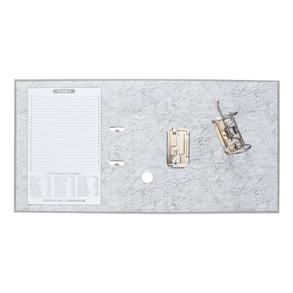 Emelőkaros iratrendező általános használatra. Kívül PP, belül fehér karton borítással, kihúzólyukkal. Cserélhető gerinccímke a feliratozáshoz. Tárolókapacitás 500 lap (A4 80gr.). A terméket lapra szerelve szállítjuk, a mellékelt emelőkaros szerkezet bepattintása gyors és egyszerű, 5 másodperc alatt elvégezhető és iratrendezőnk máris használatra kész! Katalóguskód: 12069